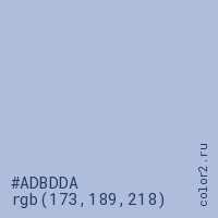 Цвет #ADBDDA в цветовой модели RGB обозначается тремя октетами (173, 189, 218) в десятичном формате и #ADBDDA в шестнадцатиричном (hex) формате, которые являются интенсивностью красного 173 (hex AD), интенсивность зелёного 189 (hex BD) и интенсивность синего 218 (hex DA).