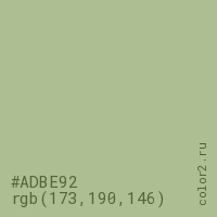 Цвет #ADBE92 в цветовой модели RGB обозначается тремя октетами (173, 190, 146) в десятичном формате и #ADBE92 в шестнадцатиричном (hex) формате, которые являются интенсивностью красного 173 (hex AD), интенсивность зелёного 190 (hex BE) и интенсивность синего 146 (hex 92).