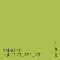 Цвет #ADBF4F в цветовой модели RGB обозначается тремя октетами (173, 191, 79) в десятичном формате и #ADBF4F в шестнадцатиричном (hex) формате, которые являются интенсивностью красного 173 (hex AD), интенсивность зелёного 191 (hex BF) и интенсивность синего 79 (hex 4F).
