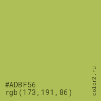 Цвет #ADBF56 в цветовой модели RGB обозначается тремя октетами (173, 191, 86) в десятичном формате и #ADBF56 в шестнадцатиричном (hex) формате, которые являются интенсивностью красного 173 (hex AD), интенсивность зелёного 191 (hex BF) и интенсивность синего 86 (hex 56).
