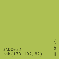 Цвет #ADC052 в цветовой модели RGB обозначается тремя октетами (173, 192, 82) в десятичном формате и #ADC052 в шестнадцатиричном (hex) формате, которые являются интенсивностью красного 173 (hex AD), интенсивность зелёного 192 (hex C0) и интенсивность синего 82 (hex 52).