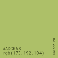 Цвет #ADC068 в цветовой модели RGB обозначается тремя октетами (173, 192, 104) в десятичном формате и #ADC068 в шестнадцатиричном (hex) формате, которые являются интенсивностью красного 173 (hex AD), интенсивность зелёного 192 (hex C0) и интенсивность синего 104 (hex 68).