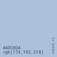 Цвет #ADC0DA в цветовой модели RGB обозначается тремя октетами (173, 192, 218) в десятичном формате и #ADC0DA в шестнадцатиричном (hex) формате, которые являются интенсивностью красного 173 (hex AD), интенсивность зелёного 192 (hex C0) и интенсивность синего 218 (hex DA).