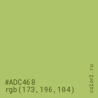 Цвет #ADC468 в цветовой модели RGB обозначается тремя октетами (173, 196, 104) в десятичном формате и #ADC468 в шестнадцатиричном (hex) формате, которые являются интенсивностью красного 173 (hex AD), интенсивность зелёного 196 (hex C4) и интенсивность синего 104 (hex 68).
