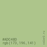 Цвет #ADC48D в цветовой модели RGB обозначается тремя октетами (173, 196, 141) в десятичном формате и #ADC48D в шестнадцатиричном (hex) формате, которые являются интенсивностью красного 173 (hex AD), интенсивность зелёного 196 (hex C4) и интенсивность синего 141 (hex 8D).