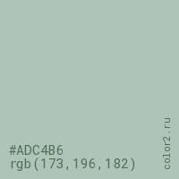 Цвет #ADC4B6 в цветовой модели RGB обозначается тремя октетами (173, 196, 182) в десятичном формате и #ADC4B6 в шестнадцатиричном (hex) формате, которые являются интенсивностью красного 173 (hex AD), интенсивность зелёного 196 (hex C4) и интенсивность синего 182 (hex B6).