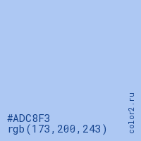 Цвет #ADC8F3 в цветовой модели RGB обозначается тремя октетами (173, 200, 243) в десятичном формате и #ADC8F3 в шестнадцатиричном (hex) формате, которые являются интенсивностью красного 173 (hex AD), интенсивность зелёного 200 (hex C8) и интенсивность синего 243 (hex F3).