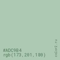 Цвет #ADC9B4 в цветовой модели RGB обозначается тремя октетами (173, 201, 180) в десятичном формате и #ADC9B4 в шестнадцатиричном (hex) формате, которые являются интенсивностью красного 173 (hex AD), интенсивность зелёного 201 (hex C9) и интенсивность синего 180 (hex B4).