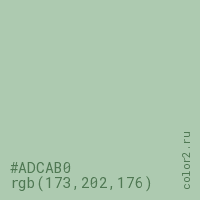Цвет #ADCAB0 в цветовой модели RGB обозначается тремя октетами (173, 202, 176) в десятичном формате и #ADCAB0 в шестнадцатиричном (hex) формате, которые являются интенсивностью красного 173 (hex AD), интенсивность зелёного 202 (hex CA) и интенсивность синего 176 (hex B0).