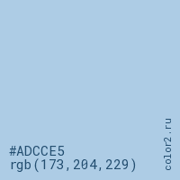 Цвет #ADCCE5 в цветовой модели RGB обозначается тремя октетами (173, 204, 229) в десятичном формате и #ADCCE5 в шестнадцатиричном (hex) формате, которые являются интенсивностью красного 173 (hex AD), интенсивность зелёного 204 (hex CC) и интенсивность синего 229 (hex E5).