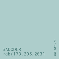 Цвет #ADCDCB в цветовой модели RGB обозначается тремя октетами (173, 205, 203) в десятичном формате и #ADCDCB в шестнадцатиричном (hex) формате, которые являются интенсивностью красного 173 (hex AD), интенсивность зелёного 205 (hex CD) и интенсивность синего 203 (hex CB).