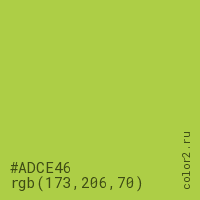 Цвет #ADCE46 в цветовой модели RGB обозначается тремя октетами (173, 206, 70) в десятичном формате и #ADCE46 в шестнадцатиричном (hex) формате, которые являются интенсивностью красного 173 (hex AD), интенсивность зелёного 206 (hex CE) и интенсивность синего 70 (hex 46).