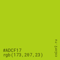 Цвет #ADCF17 в цветовой модели RGB обозначается тремя октетами (173, 207, 23) в десятичном формате и #ADCF17 в шестнадцатиричном (hex) формате, которые являются интенсивностью красного 173 (hex AD), интенсивность зелёного 207 (hex CF) и интенсивность синего 23 (hex 17).