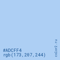Цвет #ADCFF4 в цветовой модели RGB обозначается тремя октетами (173, 207, 244) в десятичном формате и #ADCFF4 в шестнадцатиричном (hex) формате, которые являются интенсивностью красного 173 (hex AD), интенсивность зелёного 207 (hex CF) и интенсивность синего 244 (hex F4).