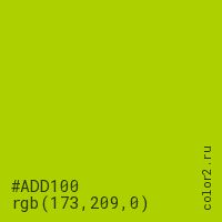 Цвет #ADD100 в цветовой модели RGB обозначается тремя октетами (173, 209, 0) в десятичном формате и #ADD100 в шестнадцатиричном (hex) формате, которые являются интенсивностью красного 173 (hex AD), интенсивность зелёного 209 (hex D1) и интенсивность синего 0 (hex 00).
