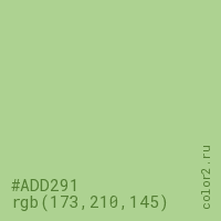 Цвет #ADD291 в цветовой модели RGB обозначается тремя октетами (173, 210, 145) в десятичном формате и #ADD291 в шестнадцатиричном (hex) формате, которые являются интенсивностью красного 173 (hex AD), интенсивность зелёного 210 (hex D2) и интенсивность синего 145 (hex 91).