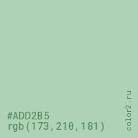 Цвет #ADD2B5 в цветовой модели RGB обозначается тремя октетами (173, 210, 181) в десятичном формате и #ADD2B5 в шестнадцатиричном (hex) формате, которые являются интенсивностью красного 173 (hex AD), интенсивность зелёного 210 (hex D2) и интенсивность синего 181 (hex B5).