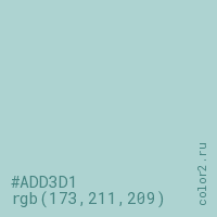 Цвет #ADD3D1 в цветовой модели RGB обозначается тремя октетами (173, 211, 209) в десятичном формате и #ADD3D1 в шестнадцатиричном (hex) формате, которые являются интенсивностью красного 173 (hex AD), интенсивность зелёного 211 (hex D3) и интенсивность синего 209 (hex D1).