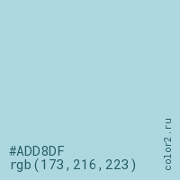 Цвет #ADD8DF в цветовой модели RGB обозначается тремя октетами (173, 216, 223) в десятичном формате и #ADD8DF в шестнадцатиричном (hex) формате, которые являются интенсивностью красного 173 (hex AD), интенсивность зелёного 216 (hex D8) и интенсивность синего 223 (hex DF).