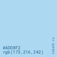 Цвет #ADD8F2 в цветовой модели RGB обозначается тремя октетами (173, 216, 242) в десятичном формате и #ADD8F2 в шестнадцатиричном (hex) формате, которые являются интенсивностью красного 173 (hex AD), интенсивность зелёного 216 (hex D8) и интенсивность синего 242 (hex F2).