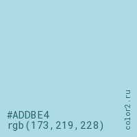 Цвет #ADDBE4 в цветовой модели RGB обозначается тремя октетами (173, 219, 228) в десятичном формате и #ADDBE4 в шестнадцатиричном (hex) формате, которые являются интенсивностью красного 173 (hex AD), интенсивность зелёного 219 (hex DB) и интенсивность синего 228 (hex E4).