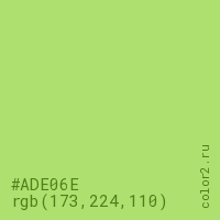 Цвет #ADE06E в цветовой модели RGB обозначается тремя октетами (173, 224, 110) в десятичном формате и #ADE06E в шестнадцатиричном (hex) формате, которые являются интенсивностью красного 173 (hex AD), интенсивность зелёного 224 (hex E0) и интенсивность синего 110 (hex 6E).