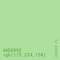 Цвет #ADE09E в цветовой модели RGB обозначается тремя октетами (173, 224, 158) в десятичном формате и #ADE09E в шестнадцатиричном (hex) формате, которые являются интенсивностью красного 173 (hex AD), интенсивность зелёного 224 (hex E0) и интенсивность синего 158 (hex 9E).