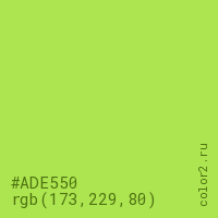 Цвет #ADE550 в цветовой модели RGB обозначается тремя октетами (173, 229, 80) в десятичном формате и #ADE550 в шестнадцатиричном (hex) формате, которые являются интенсивностью красного 173 (hex AD), интенсивность зелёного 229 (hex E5) и интенсивность синего 80 (hex 50).