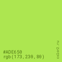 Цвет #ADE650 в цветовой модели RGB обозначается тремя октетами (173, 230, 80) в десятичном формате и #ADE650 в шестнадцатиричном (hex) формате, которые являются интенсивностью красного 173 (hex AD), интенсивность зелёного 230 (hex E6) и интенсивность синего 80 (hex 50).