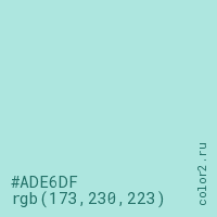 Цвет #ADE6DF в цветовой модели RGB обозначается тремя октетами (173, 230, 223) в десятичном формате и #ADE6DF в шестнадцатиричном (hex) формате, которые являются интенсивностью красного 173 (hex AD), интенсивность зелёного 230 (hex E6) и интенсивность синего 223 (hex DF).