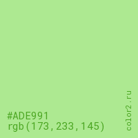 Цвет #ADE991 в цветовой модели RGB обозначается тремя октетами (173, 233, 145) в десятичном формате и #ADE991 в шестнадцатиричном (hex) формате, которые являются интенсивностью красного 173 (hex AD), интенсивность зелёного 233 (hex E9) и интенсивность синего 145 (hex 91).