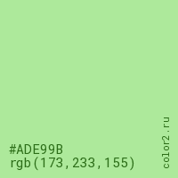 Цвет #ADE99B в цветовой модели RGB обозначается тремя октетами (173, 233, 155) в десятичном формате и #ADE99B в шестнадцатиричном (hex) формате, которые являются интенсивностью красного 173 (hex AD), интенсивность зелёного 233 (hex E9) и интенсивность синего 155 (hex 9B).