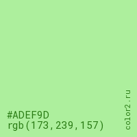 Цвет #ADEF9D в цветовой модели RGB обозначается тремя октетами (173, 239, 157) в десятичном формате и #ADEF9D в шестнадцатиричном (hex) формате, которые являются интенсивностью красного 173 (hex AD), интенсивность зелёного 239 (hex EF) и интенсивность синего 157 (hex 9D).