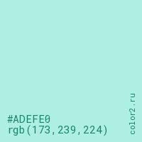 Цвет #ADEFE0 в цветовой модели RGB обозначается тремя октетами (173, 239, 224) в десятичном формате и #ADEFE0 в шестнадцатиричном (hex) формате, которые являются интенсивностью красного 173 (hex AD), интенсивность зелёного 239 (hex EF) и интенсивность синего 224 (hex E0).