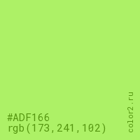 Цвет #ADF166 в цветовой модели RGB обозначается тремя октетами (173, 241, 102) в десятичном формате и #ADF166 в шестнадцатиричном (hex) формате, которые являются интенсивностью красного 173 (hex AD), интенсивность зелёного 241 (hex F1) и интенсивность синего 102 (hex 66).