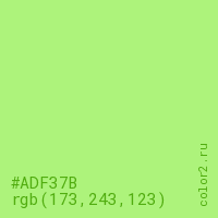 Цвет #ADF37B в цветовой модели RGB обозначается тремя октетами (173, 243, 123) в десятичном формате и #ADF37B в шестнадцатиричном (hex) формате, которые являются интенсивностью красного 173 (hex AD), интенсивность зелёного 243 (hex F3) и интенсивность синего 123 (hex 7B).