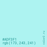 Цвет #ADF3F1 в цветовой модели RGB обозначается тремя октетами (173, 243, 241) в десятичном формате и #ADF3F1 в шестнадцатиричном (hex) формате, которые являются интенсивностью красного 173 (hex AD), интенсивность зелёного 243 (hex F3) и интенсивность синего 241 (hex F1).