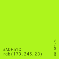 Цвет #ADF51C в цветовой модели RGB обозначается тремя октетами (173, 245, 28) в десятичном формате и #ADF51C в шестнадцатиричном (hex) формате, которые являются интенсивностью красного 173 (hex AD), интенсивность зелёного 245 (hex F5) и интенсивность синего 28 (hex 1C).