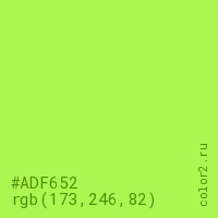 Цвет #ADF652 в цветовой модели RGB обозначается тремя октетами (173, 246, 82) в десятичном формате и #ADF652 в шестнадцатиричном (hex) формате, которые являются интенсивностью красного 173 (hex AD), интенсивность зелёного 246 (hex F6) и интенсивность синего 82 (hex 52).