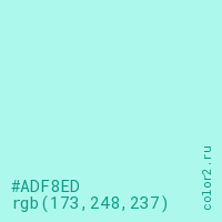 Цвет #ADF8ED в цветовой модели RGB обозначается тремя октетами (173, 248, 237) в десятичном формате и #ADF8ED в шестнадцатиричном (hex) формате, которые являются интенсивностью красного 173 (hex AD), интенсивность зелёного 248 (hex F8) и интенсивность синего 237 (hex ED).
