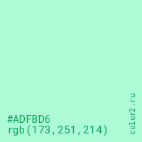 Цвет #ADFBD6 в цветовой модели RGB обозначается тремя октетами (173, 251, 214) в десятичном формате и #ADFBD6 в шестнадцатиричном (hex) формате, которые являются интенсивностью красного 173 (hex AD), интенсивность зелёного 251 (hex FB) и интенсивность синего 214 (hex D6).