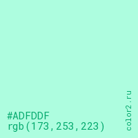 Цвет #ADFDDF в цветовой модели RGB обозначается тремя октетами (173, 253, 223) в десятичном формате и #ADFDDF в шестнадцатиричном (hex) формате, которые являются интенсивностью красного 173 (hex AD), интенсивность зелёного 253 (hex FD) и интенсивность синего 223 (hex DF).