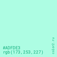Цвет #ADFDE3 в цветовой модели RGB обозначается тремя октетами (173, 253, 227) в десятичном формате и #ADFDE3 в шестнадцатиричном (hex) формате, которые являются интенсивностью красного 173 (hex AD), интенсивность зелёного 253 (hex FD) и интенсивность синего 227 (hex E3).