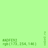 Цвет #ADFE92 в цветовой модели RGB обозначается тремя октетами (173, 254, 146) в десятичном формате и #ADFE92 в шестнадцатиричном (hex) формате, которые являются интенсивностью красного 173 (hex AD), интенсивность зелёного 254 (hex FE) и интенсивность синего 146 (hex 92).