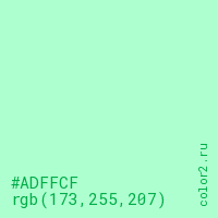 Цвет #ADFFCF в цветовой модели RGB обозначается тремя октетами (173, 255, 207) в десятичном формате и #ADFFCF в шестнадцатиричном (hex) формате, которые являются интенсивностью красного 173 (hex AD), интенсивность зелёного 255 (hex FF) и интенсивность синего 207 (hex CF).
