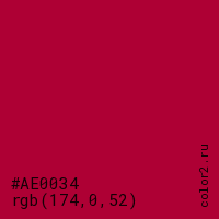 Цвет #AE0034 в цветовой модели RGB обозначается тремя октетами (174, 0, 52) в десятичном формате и #AE0034 в шестнадцатиричном (hex) формате, которые являются интенсивностью красного 174 (hex AE), интенсивность зелёного 0 (hex 00) и интенсивность синего 52 (hex 34).