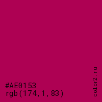 Цвет #AE0153 в цветовой модели RGB обозначается тремя октетами (174, 1, 83) в десятичном формате и #AE0153 в шестнадцатиричном (hex) формате, которые являются интенсивностью красного 174 (hex AE), интенсивность зелёного 1 (hex 01) и интенсивность синего 83 (hex 53).