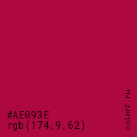 Цвет #AE093E в цветовой модели RGB обозначается тремя октетами (174, 9, 62) в десятичном формате и #AE093E в шестнадцатиричном (hex) формате, которые являются интенсивностью красного 174 (hex AE), интенсивность зелёного 9 (hex 09) и интенсивность синего 62 (hex 3E).