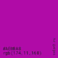 Цвет #AE0BA8 в цветовой модели RGB обозначается тремя октетами (174, 11, 168) в десятичном формате и #AE0BA8 в шестнадцатиричном (hex) формате, которые являются интенсивностью красного 174 (hex AE), интенсивность зелёного 11 (hex 0B) и интенсивность синего 168 (hex A8).
