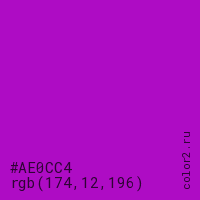 Цвет #AE0CC4 в цветовой модели RGB обозначается тремя октетами (174, 12, 196) в десятичном формате и #AE0CC4 в шестнадцатиричном (hex) формате, которые являются интенсивностью красного 174 (hex AE), интенсивность зелёного 12 (hex 0C) и интенсивность синего 196 (hex C4).